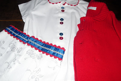 CONJUNTO EN ROJO Y BLANCO MUY SENCILLITO. BLUSITA EN BLANCA REMATADA EN ROJO Y CON ADORNO DE PEQUEÑOS BOTONES EN ROJO DE LA MISMA TELA QUE EL PANTALÓN. EL PANTALÓN ROJO EN TELA CON DIMINUTOS DIBUJOS. PUESTO MUY POQUITO.